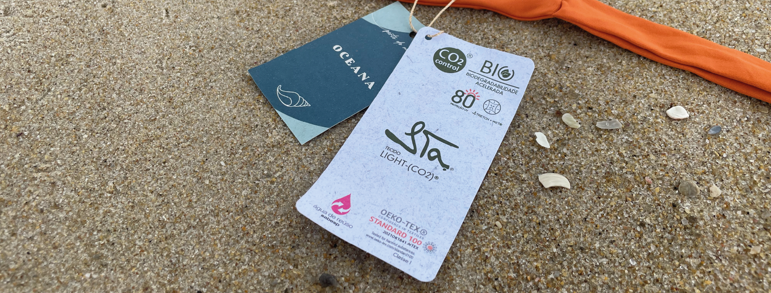 Trabalhamos com tecidos biodegradáveis para a confecção dos nossos biquínis, fabricados pela Santaconstancia e produzidos com o fio AMNI Soul Eco, da Rhodia.
